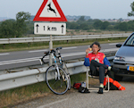 Het begon al in Zeeland, daar was ik eigenlijk al vermoeider dan goed voelt als je pas op 1/3e bent. En om 12 uur 's middags had ik er nog niet de helft op zitten; ik lag al zo'n 8 km achter. Dus hoe nog finishen in die dag, waar kon ik nog tijd winnen? En dan begint het: "ik kan niet meer fietsen, hoe kan dit nou, ik schiet niet op verd***. Fiets nou eens door...". Wat verbeeldde ik me ook. Ik zou 't toch wel ff doen in 1 dag, dat was voor mij toch geen probleem,en meer van dit soort motiverende gedachten....
